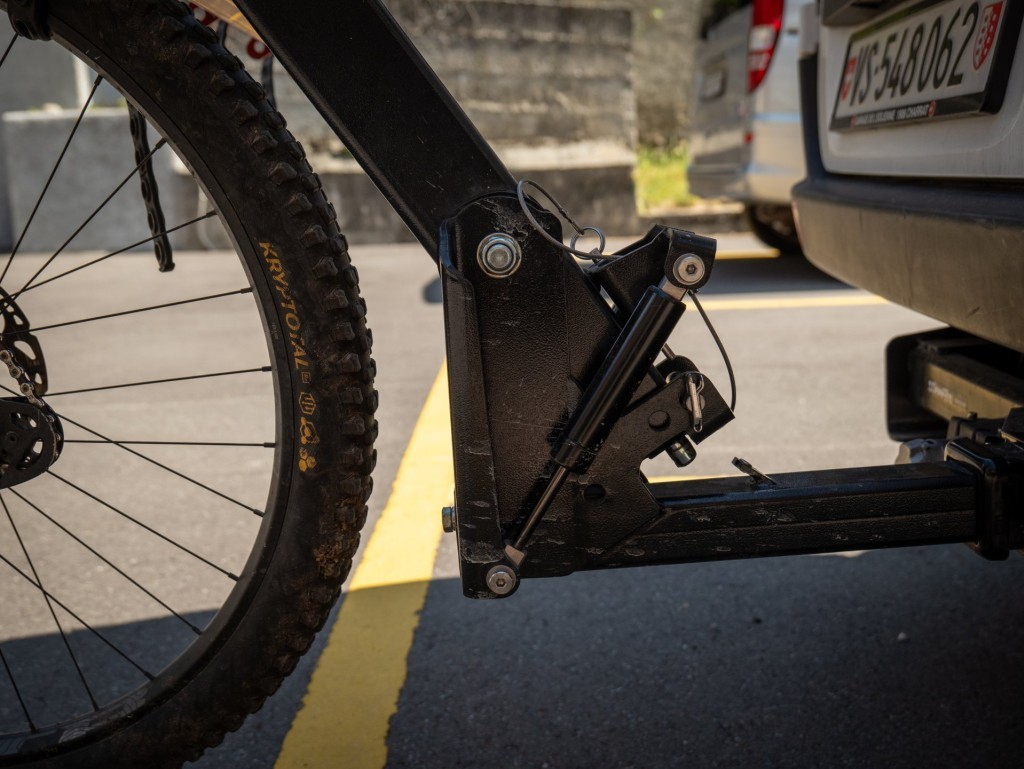 Loading up the bikes is mega easy, even a kid can do it. Just put the rack into the load position, wheelie the bike in and attach the traps on the wheels. You do need to work from left to right, starting with the biggest bike to make sure there is no interference with handlebars, brake levers and cables, but that's about it. Once strapped in you need to push the rack back up into the ‘drive’ position and you’re off. Now pushing the rack up can be done by a single person up to about 3 bikes, if you are carrying more bikes than I recommend to get a buddy with the job.