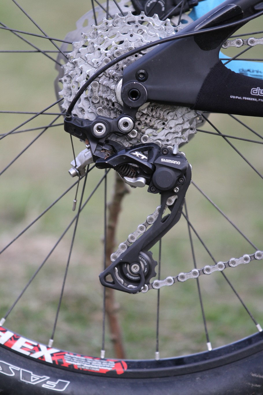 Shimano XT kit takes care of braking and drivetrain duties with the rear derailleur being a clutch type.