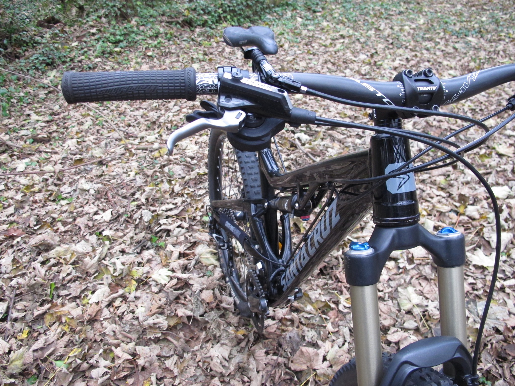 The drive train was a mix of Shimano with an SLX rear mech and Deore elsewhere, all perfectly serviceable and of decent quality. Stopping duties were catered for by Shimano Deore Hydraulic disc brakes. A set of Easton Havoc Carbon bars looked a little out of place, although most welcome, and were held in place with a Truvativ AKA stem. A Rocket V WTB Saddle was held up with a RockShox Reverb seat post, not an upgrade available on the Santa Cruz site, but a pleasure to have all the same!