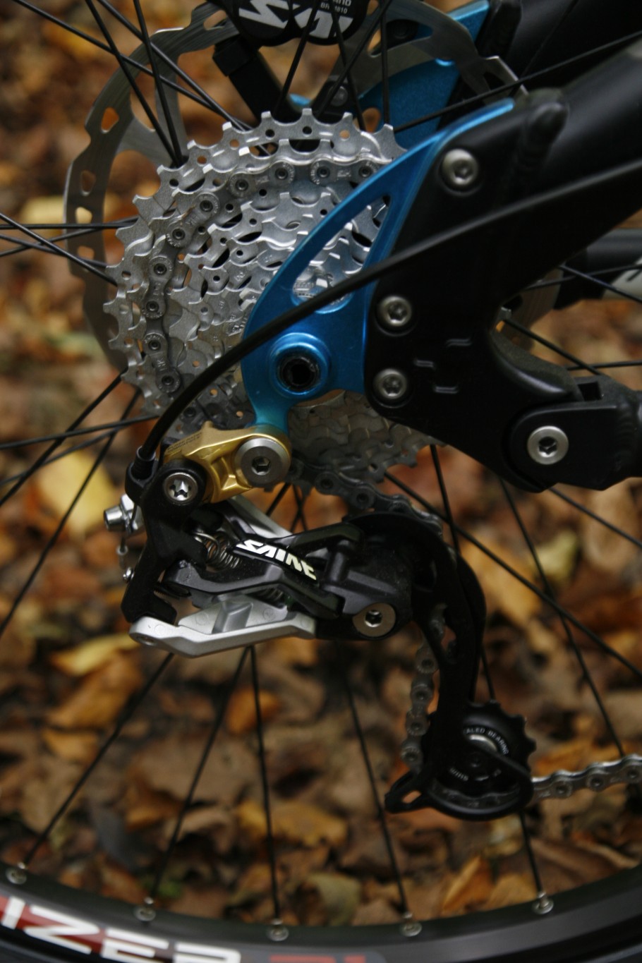 The Hanzz comes with a full Shimano Saint groupset. That’s cranks, hubs, gears and the very powerful Saint brakes. There’s a double chain ring, which does seem a bit odd for a bike like this. The front mech does have it’s own mount so if you do decide to ditch one of the rings and fit a chainguide, you can remove the mount as well. Very clever.
