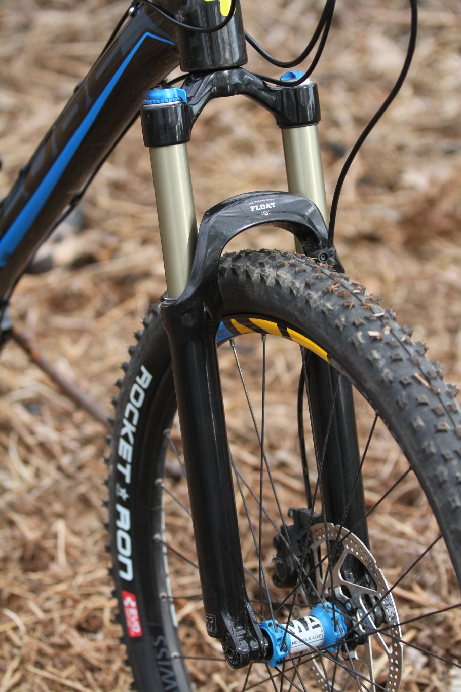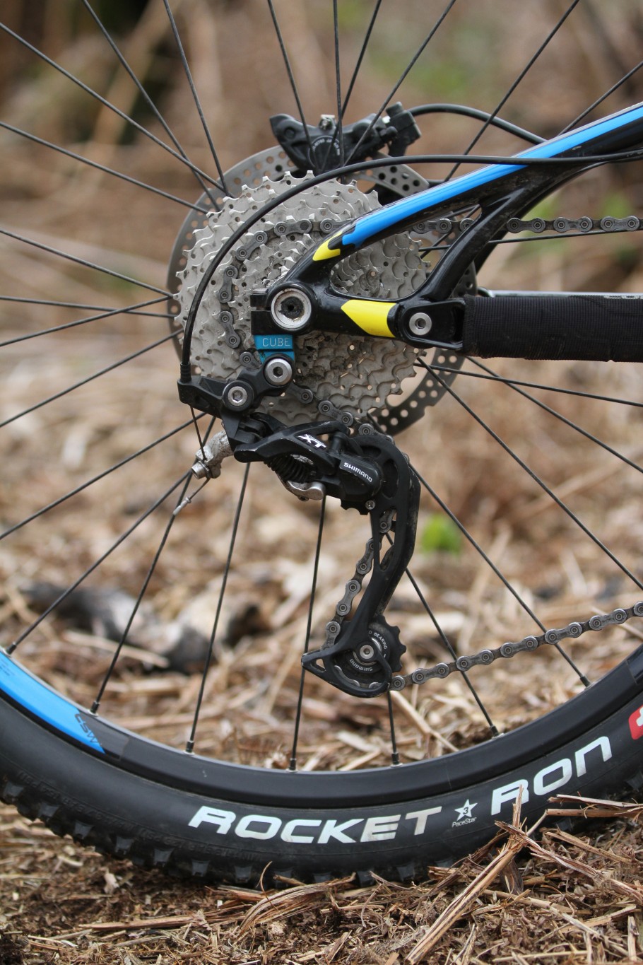 Shimano XT is used for the drivetrain and brakes, Cube have stuck to 3 x 10 speed on the Sting. Fox take care of the suspension both front and back with Syntace stem, bars and seat pin. Wheels are DT Swiss CSW MA with a 15mm front and X12 rear axle, tyres are fast rolling Schwalbe Rocket Rons in 2.25.