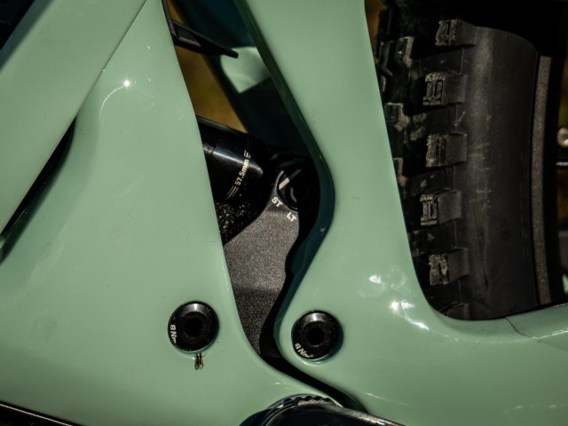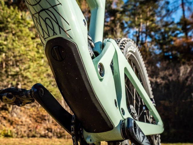 The suspension system has the rear shock mounted as low as possible to create a low center of gravity. This also results in a nice and stiff rear triangle, with a super clean look. To make sure there is no dirt entering the rear shock, they mounted a clever mud guard. This shock position makes adjusting it a little tricky, then again this is not something you do every ride.