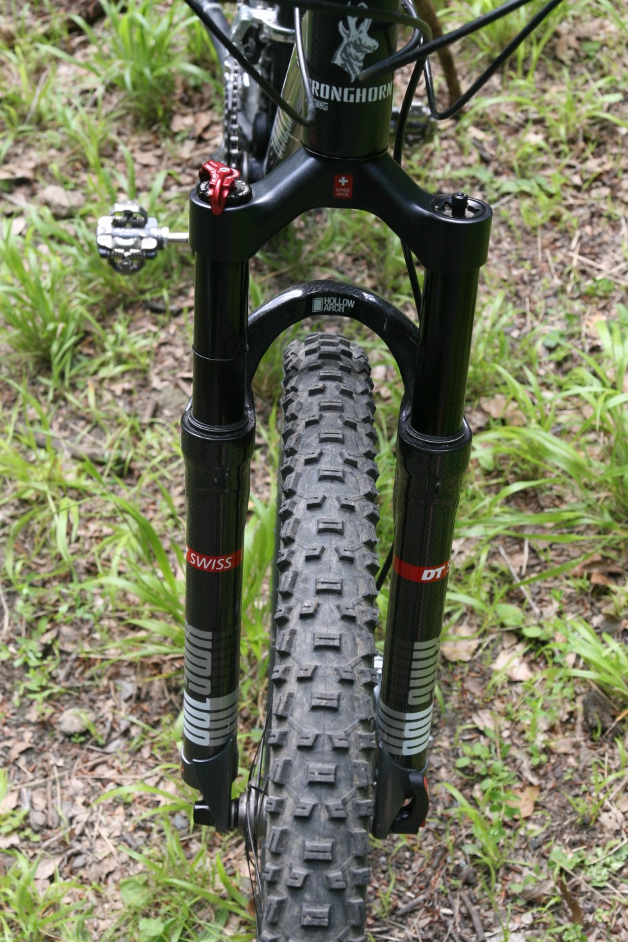 Our test bike came sporting DT Swiss carbon blingtastic suspension units in the shape of a XMC 100mm travel QR fork and XR Carbon rear shock.