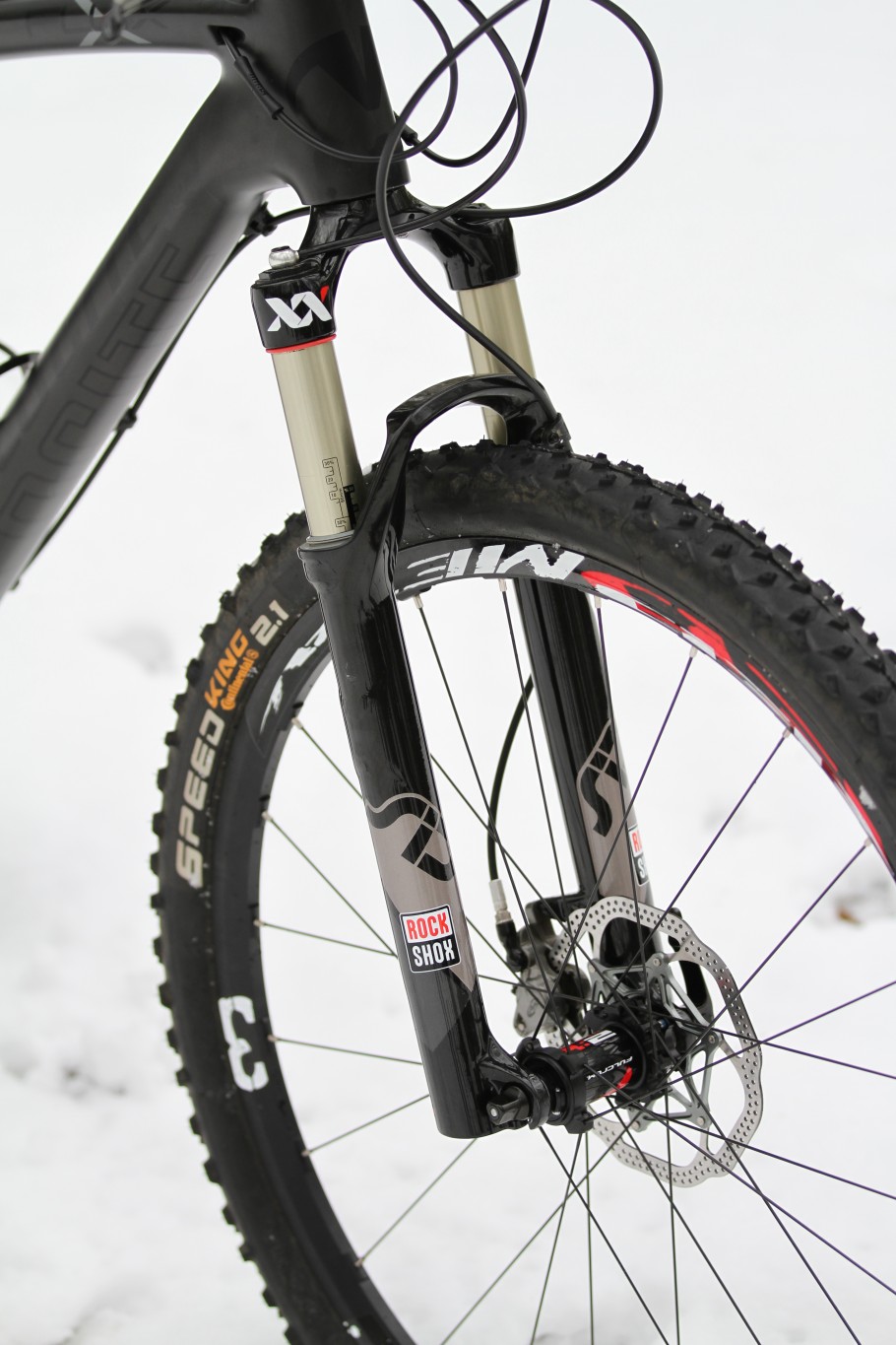 The fork is a Rock Shox Sid XX giving 100mm of travel, a legend in xc racing terms, drive train and braking are covered by Sram XX and Fulcrum Red Metal 3 wheels are shod with Continental Speed Kings.