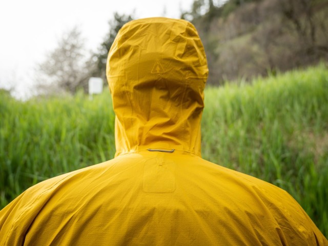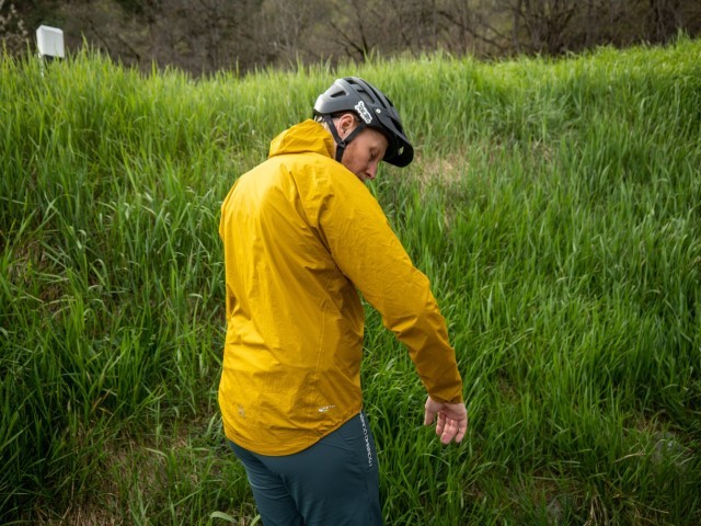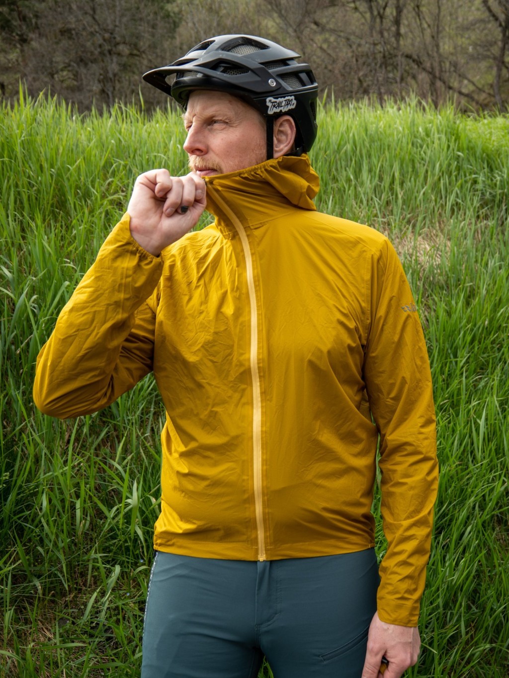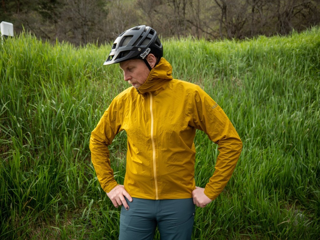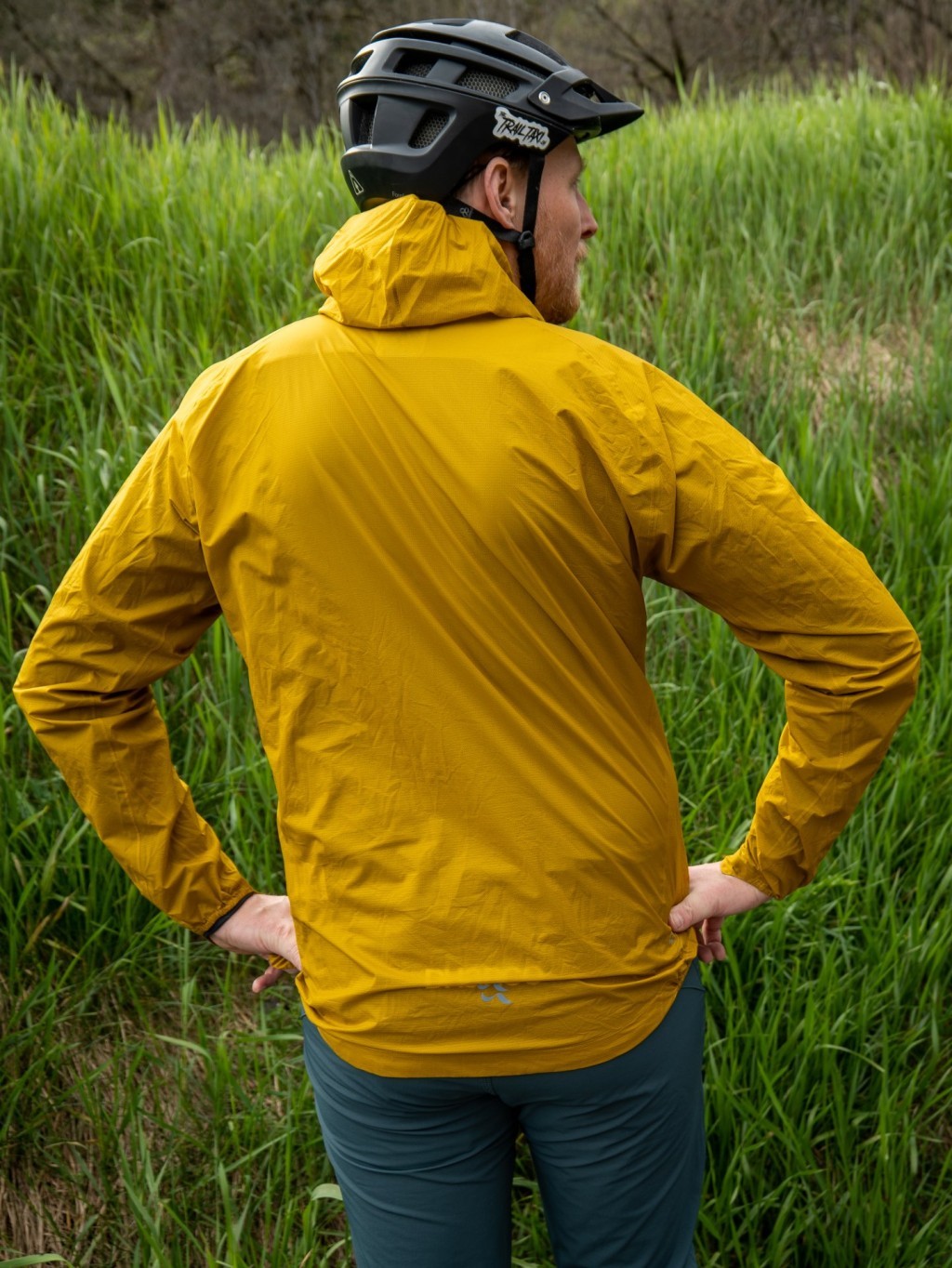 The slim cut jacket comes in sizes XS to XL in a mens and womens version. Men’s colors are black or sahara (tested) while the women's versions come in a black or red grapefruit colorway. The jacket comes with a stuff sack which has a pre tensioned elastic which makes it easy to stow and you can even attach it to your bike if you like.