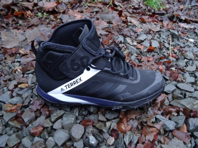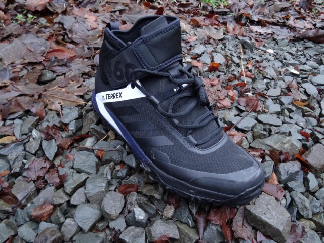 The main feature of the new model is the high-top style, which gives an ankle protection in the form of D3O pads, which harden on impact. These pads are built into a neoprene collar, which wraps around with Velcro to give support. As with all the Terrex range, we get a Stealth sole, which guarantees excellent grip but also has toe and heel grip for hiking off the bike. The rest of the uppers are ripstop, water repellent and pretty low on padding, this reduces areas for the water to be absorbed.