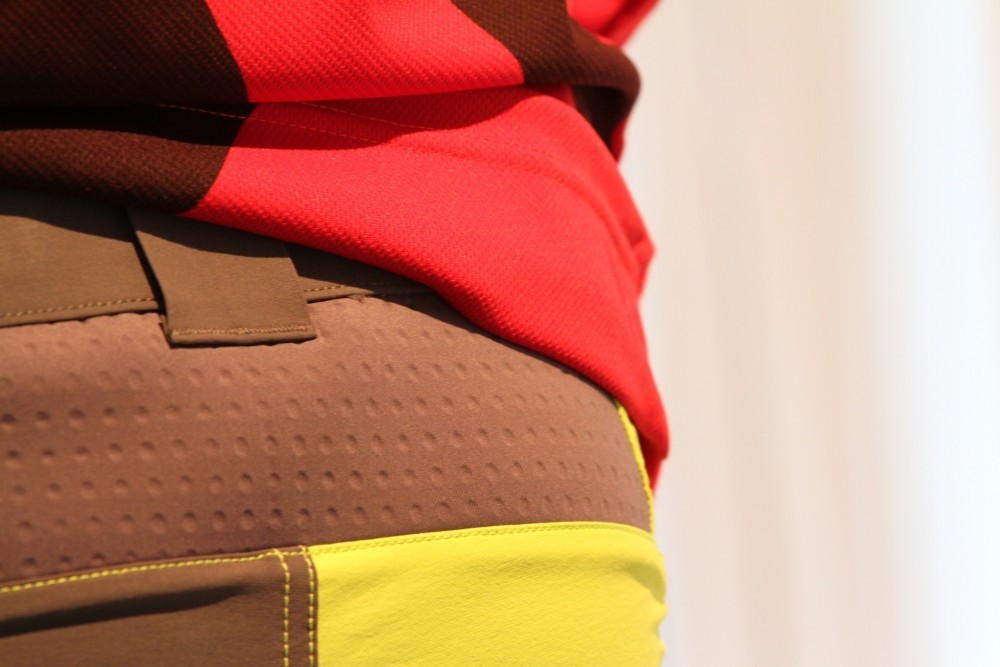 The loose style is not so much baggy, more a case of wide and long, so the hem comes just below the kneecap yet doesn’t restrict pedalling effort. The nylon and spandex blend fabric has an amazing amount of stretch, coupled with a neoprene panel at the back and we found that freedom of movement is pretty much limitless. I’m fairly sure a gymnast could still perform in these shorts!
