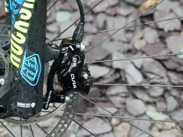 The Organic pads have worn well but gave some noise in the wet initially, but soon settled down once warmed up. Installation and removal are easy with a bolt through the pads to keep them in place. In terms of all out performance, I expected the Cura to have more instant stopping power, but instead, they delivered a beautifully gradual increase which was easy to moderate and provided a highly sensitive system. Although I thought I would prefer a more grabby brake, I never felt out of control at any point, the power always there if needed.