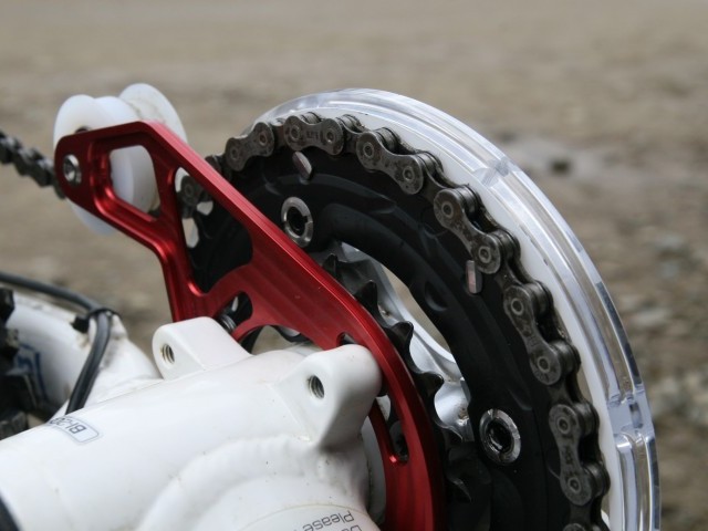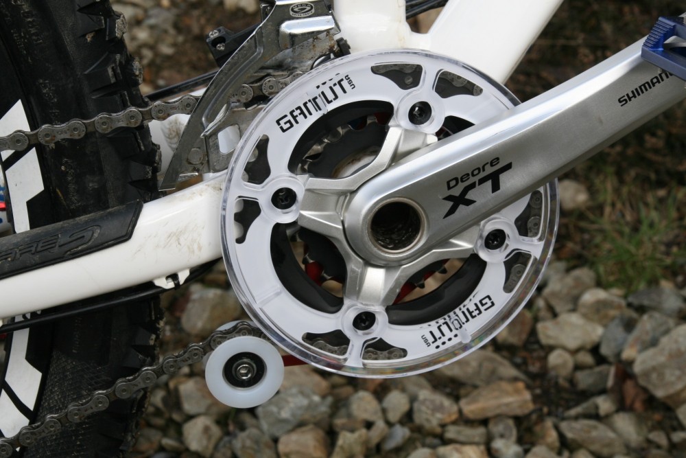 When you open up the box for the P30 bash ring and chain guide you’ll be surprised to find there isn’t much in it. Simplicity is something that Gamut have gone for here and it certainly shows. The bash ring is machined to save on weight rather than being a solid lump. The machining has been done to direct energy from impact away from the more expensive bits of your drivetrain. This isn’t just some fancy plastic work! The guide itself is very easy to fit to the frame, ours was ISCG 05 mount and we had it on in about 5 minutes. We fitted the bash ring to an XT crankset and aside from the usual trauma of getting the old chain rings off it was a very simple job. Albeit one that needed a vice!