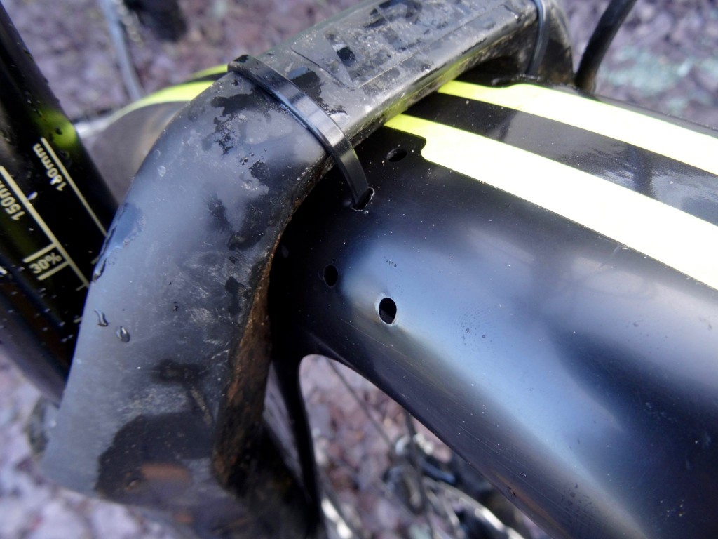 Installation is quick and easy with the cable ties threading through the various holes in the guard to accommodate an assortment of different shaped forks. The top is almost perforated with holes giving the perfect fit and holding the guard precisely, being close, but not too close, to the tyre. The plastic is rigid enough to hold its shape firmly, yet is soft and bendable so it flexes if it takes a hit.