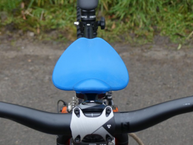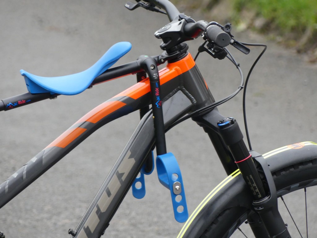 Simply, the Mac Ride is an adjustable crossbar seat which clamps between the seat tube and steerer tube of any bike. The seat is a saddle-shaped scoop with two stirrups for their feet. Again these are adjustable. Replacing one headset spacer with a 'special' one to allow the bars to rotate is the only bike modification required.