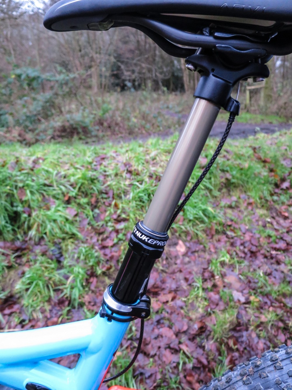 It features 125mm of drop, a cable actuated, hydraulic infinite adjustment system and a triple key-way design to reduce lateral movement. The design is also “air less” which puts a lot less stress on the seals and increases the durability and reliability.