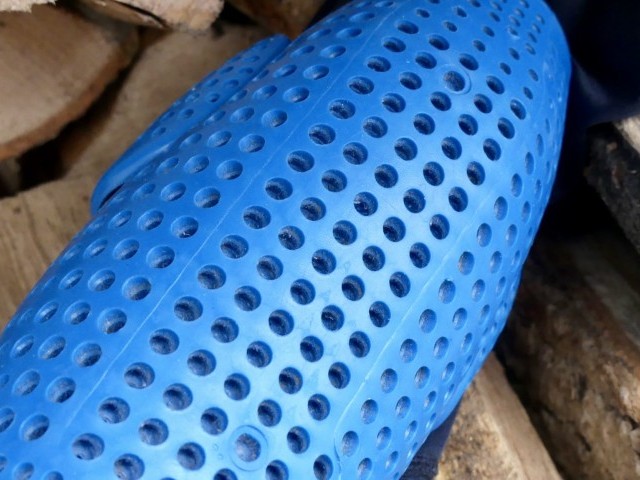 The material that provides the protection is flexible and rubbery in feel, although under impact firms up to absorb forces. The shape covers all the kneecap and extends low enough to cover some of the upper shins. Two smaller pads cover the inside and outside of the knee to give all-round cover to the knee.