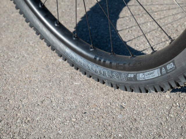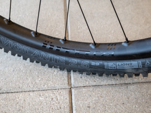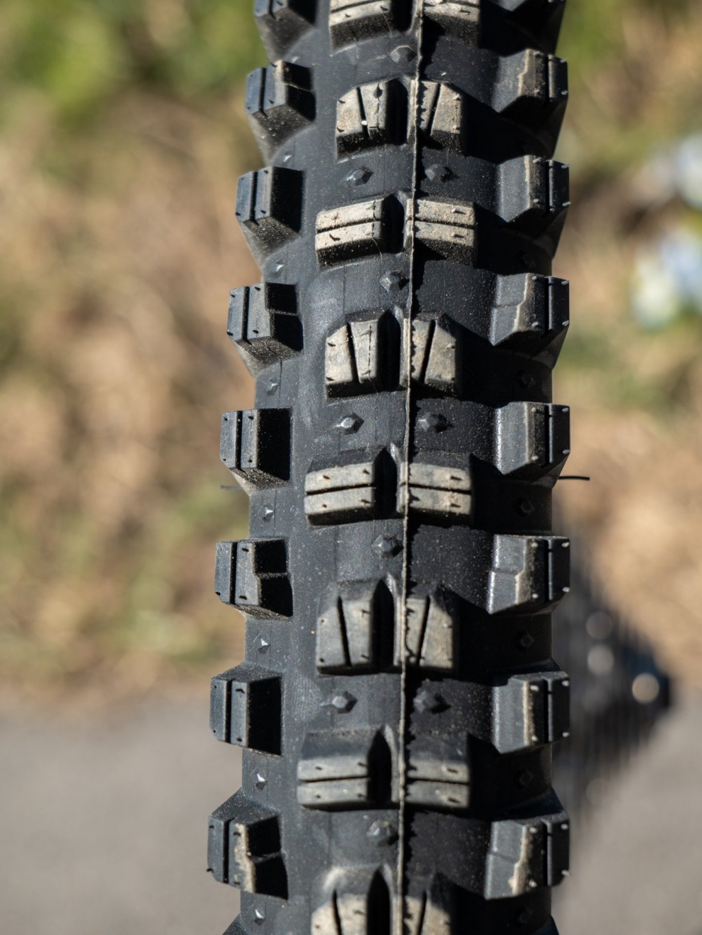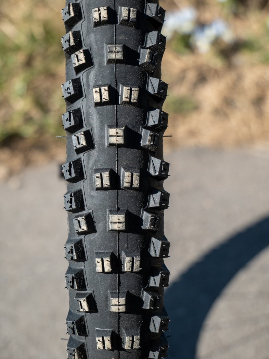 On the rear we mounted the Judge, a big knobbed tire with horizontal blocks aimed at tons of traction. Although presented as a rear tire, I suspect it would work really well as a front tire too, especially when things get steep and you’re looking for ways to slow down. Contrary to the Vigilante, the Judge is only available in 27,5 or 29’’ versions, with the High Grip / Tough TCS compound. Our 29’’ High Grip version weighed in at 1290 grams.