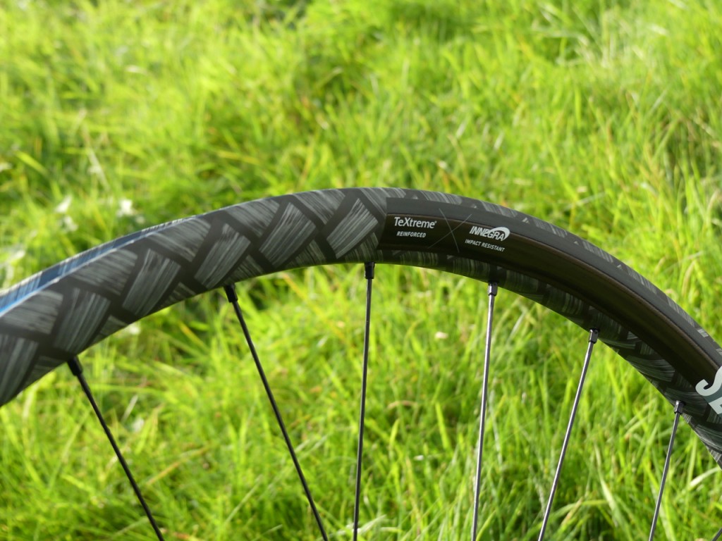 The outer layer is more complex and combines Innegra and T700 carbon fibres in a hybrid fabric called TeXtreme. This TeXtreme fabric is known as a 'spread tow' fabric, which allows for straighter fibres which in turn create a thinner laminate. This thinner, stronger and lighter layer is applied to the outer of the rim and gives it a very funky finish too.