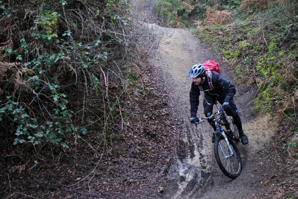 Descending when conditions are soft and roots and rocks are slippery also requires commitment and a soft feel. Getting tight on the bike is a recipe for disaster. Soft legs and supple arms responding to the trail surface are crucial. Speed control and your braking technique are going to be tested. Simply locking the back up and then flirting with the front brake is far from advisable. Balanced braking that is achieved through squeezing rather than snatching it is crucial if you are going to stay in control of your bike and your emotions. Compressions at the bottom of any steep section require a little more care than in the dry. Water often collects and mud thicker at the transition from steep to flat, thump your weight onto the front of the bike as you hit the compression and you will risk the front wheel being squirted out from under you. Control your mass with your legs don't just rely on your arms and your forks to do all the work. Over-rotate at your peril. There may be times when the bike starts to feel like it is taking its own line, as wheels drift. When this happens freezing up will not help. Keep looking to where you want the bike to be next and line you hips and torso with that point.