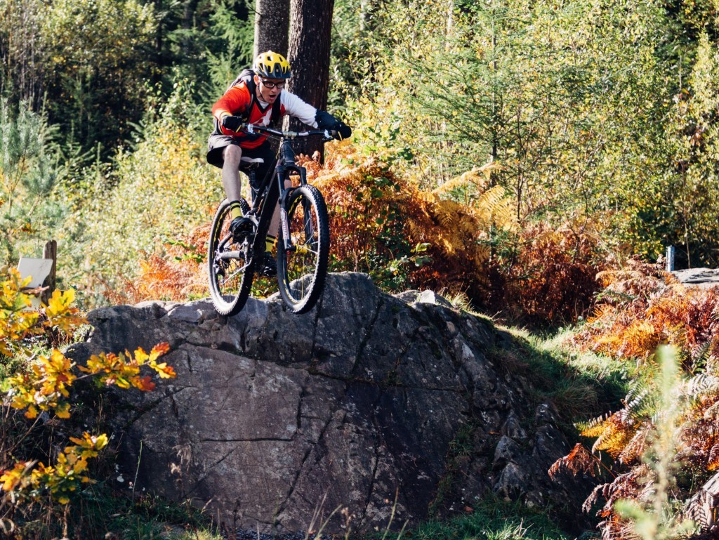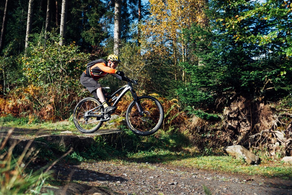 As the rear wheel approaches the edge, get ready to drive the legs down simultaneously easing the pressure through the back brake to avoid locking up. Remember to keep looking up the trail, we spot the lip/edge of the drop-off by moving the eyes not the whole head. In this instance for practice try and bring the bike to a stop as soon as possible having rolled off the drop-off. This practice technique helps with building muscle memory to not only absorb the landing but also for the braking control element. You gain that important feeling of where the contact patch of each tyre/wheel lies and the amount of grip available from your tyre/drop-off combo.